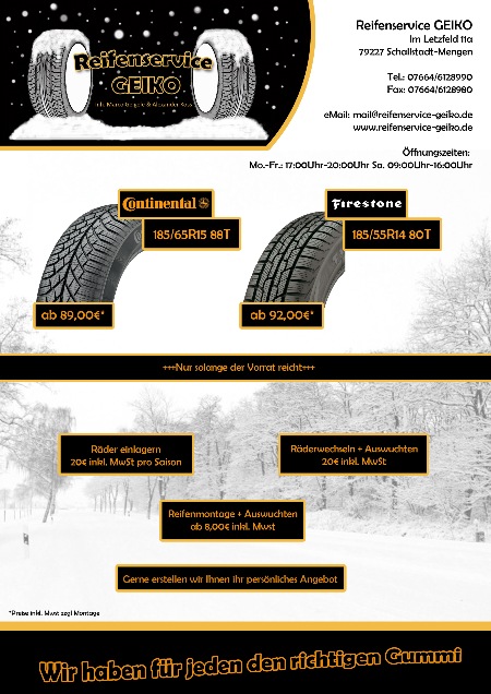 In der Zwischenzeit erreichen Sie uns wie immer telefonisch unter 07664/6128990 und per Telefax unter 07664/6128980. Natürlich freuen wir uns auch über eine E-Mail von Ihnen, die Sie an diese Adresse senden können: mail@reifenservice-geiko.de